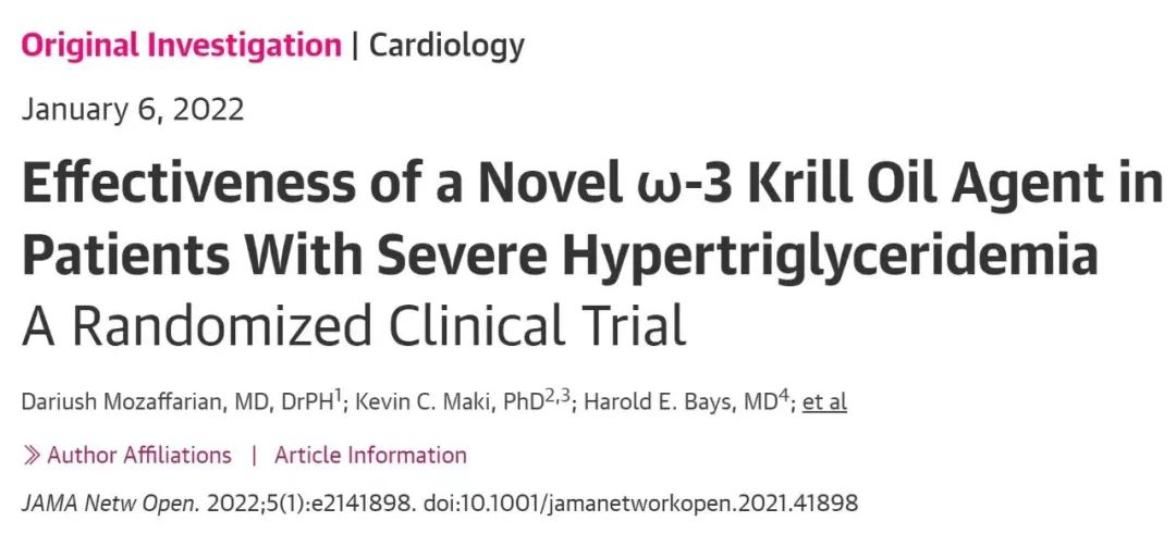 迄今为止在甘油三酯水平极高的患者中对Omega-3制剂进行的最大规模的临床研究显示,海洋磷脂型磷虾油能够显著降低血液中的甘油三酯水平,这是衡量心脏健康的关键指标。这一最新研究于2022年1月6日发表于国际知名期刊 JAMA Network Open。
