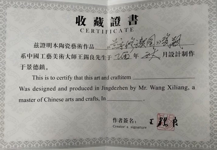 这件《兰亭修褉图》瓷瓶不仅是一件艺术珍品,更是中国当代陶瓷收藏的标杆之作。从创作背景来看,它是王锡良晚年呕心沥血之作,据收藏证书记载,作品创作于丙戌年(2006 年),历时近四年完成,期间王锡良反复修改构图、调试色彩,仅烧制环节就历经多次失败,最终才呈现出如今的完美效果,成品率不足 5%,足见其珍贵。